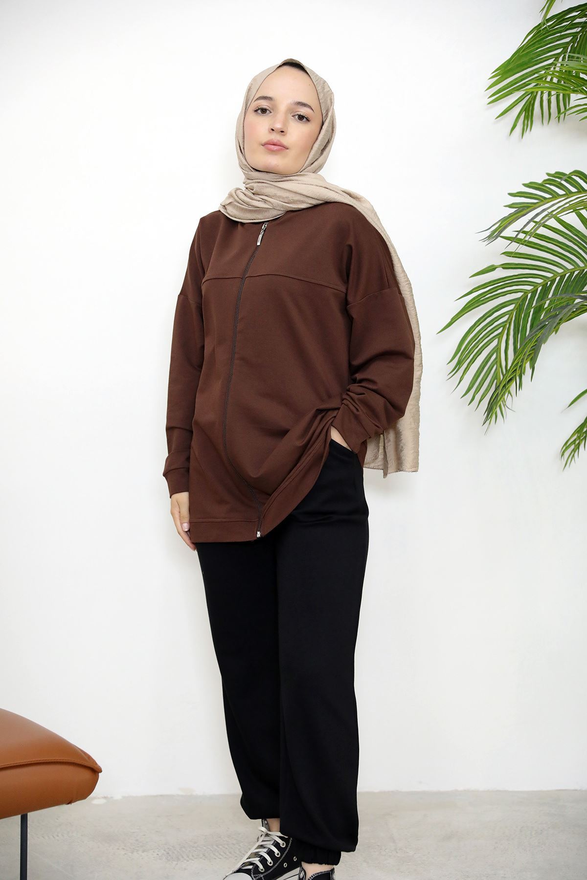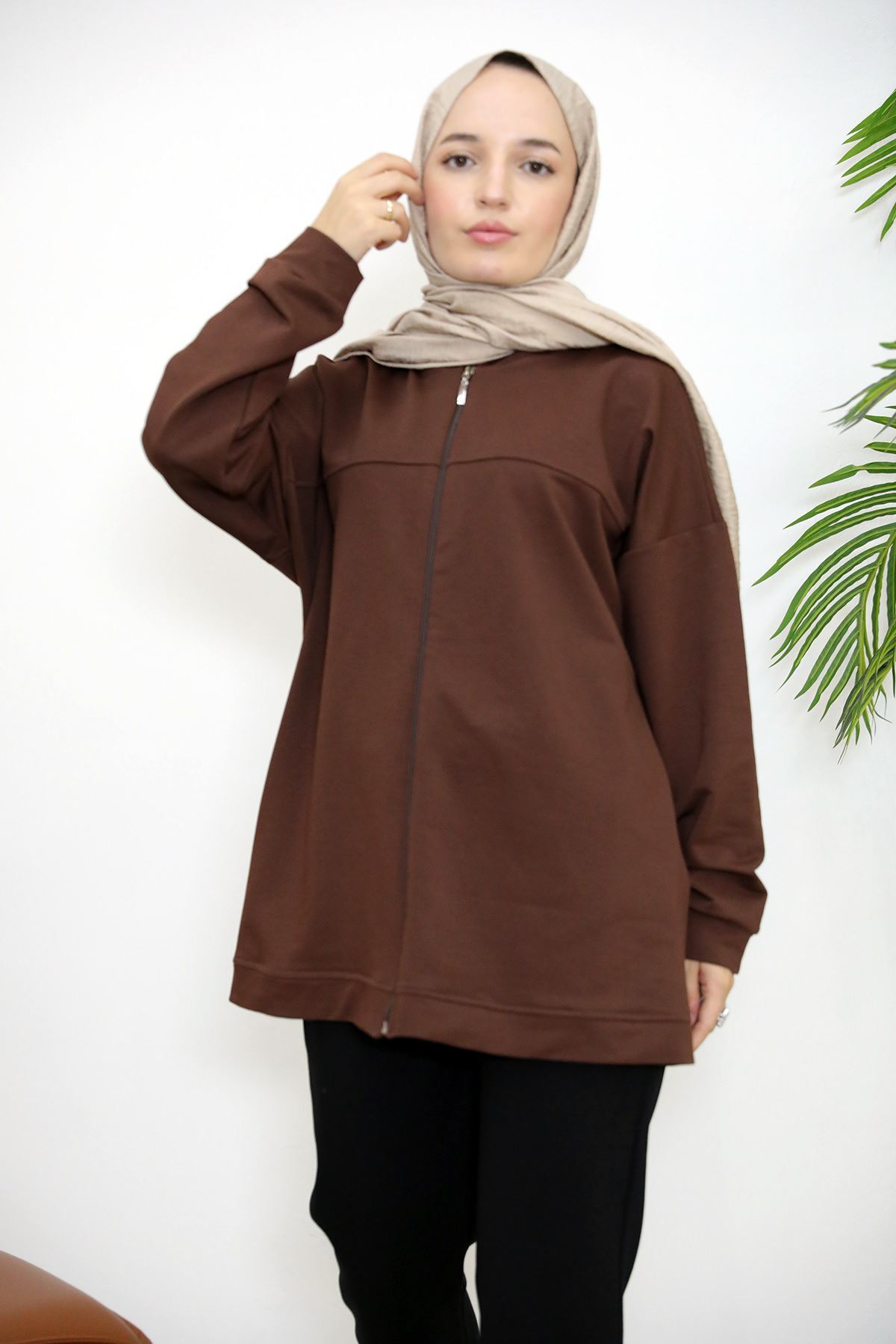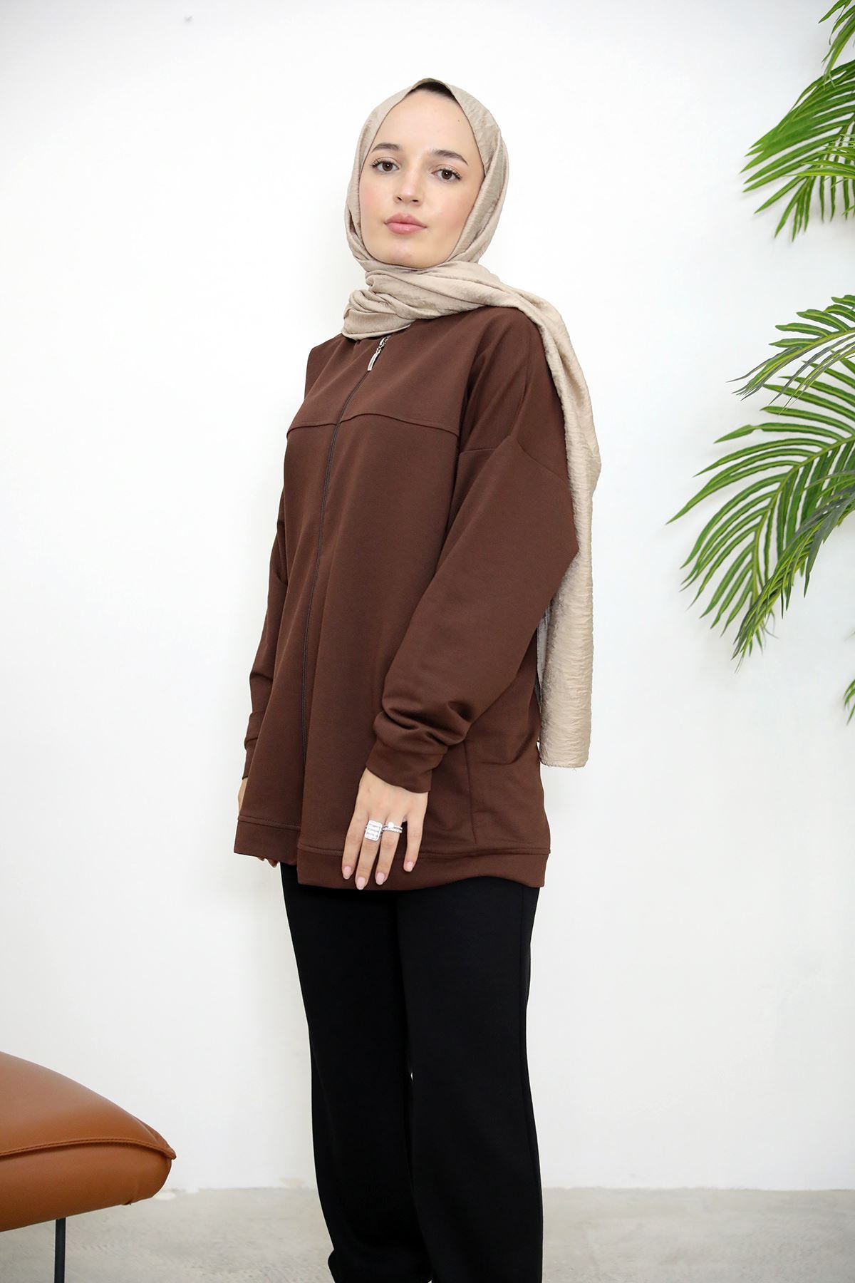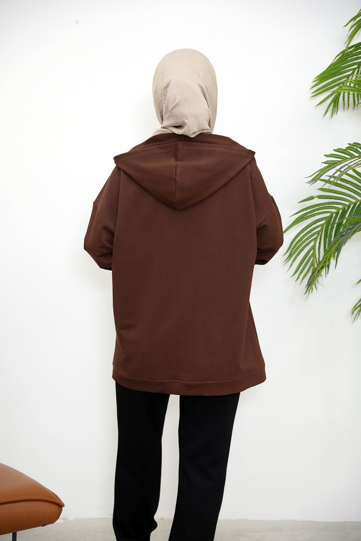 HIR02432-KHV Kapşonlu Fermuar Detay Hırka-Kahve