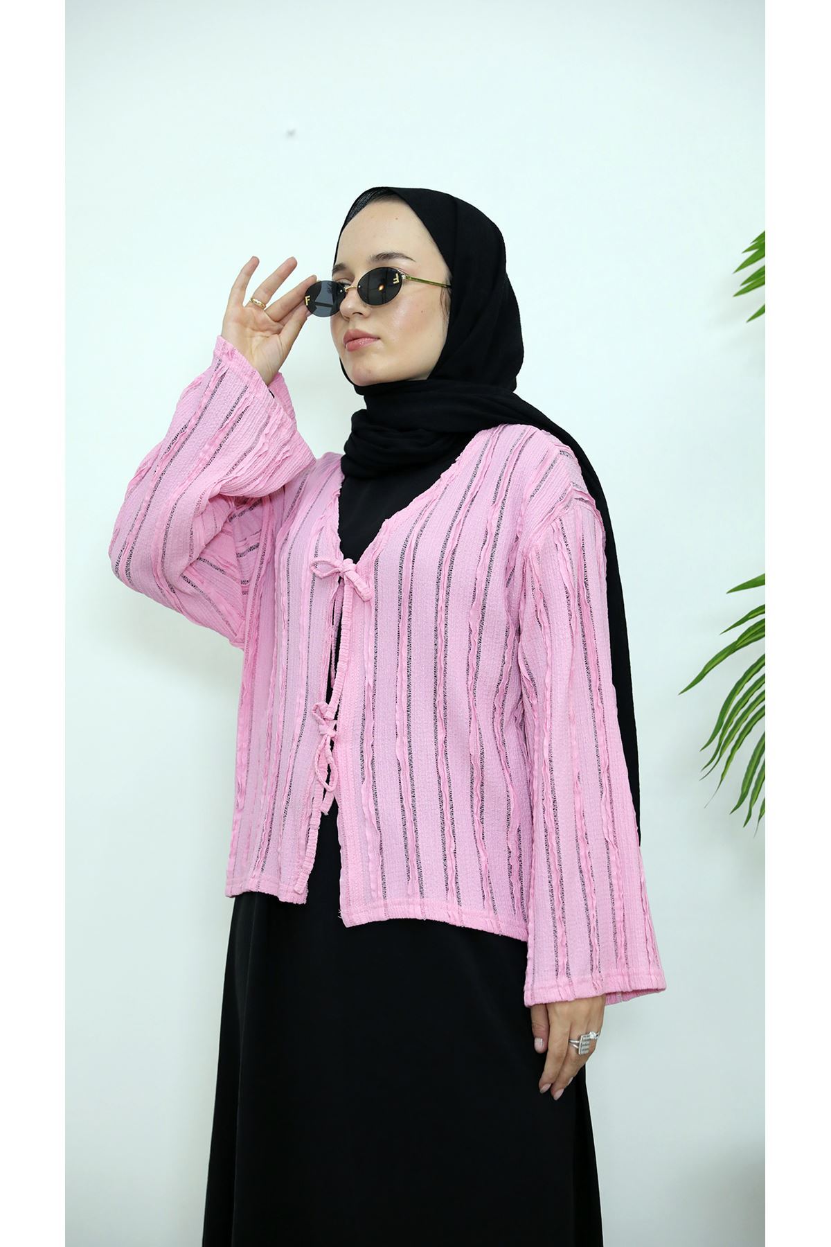 TUN05925-PMB Pileli Ön İki Bağlamalı Tunik-Pembe